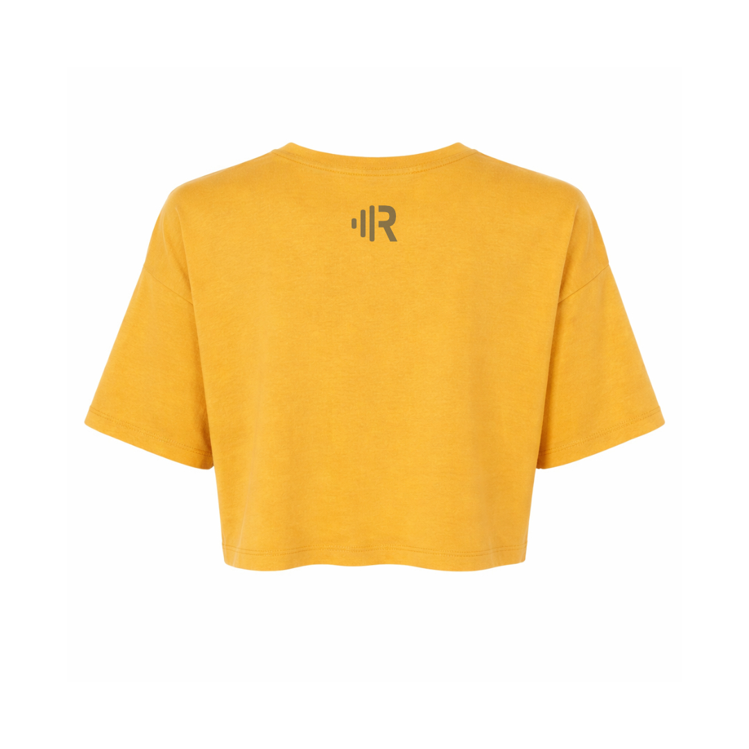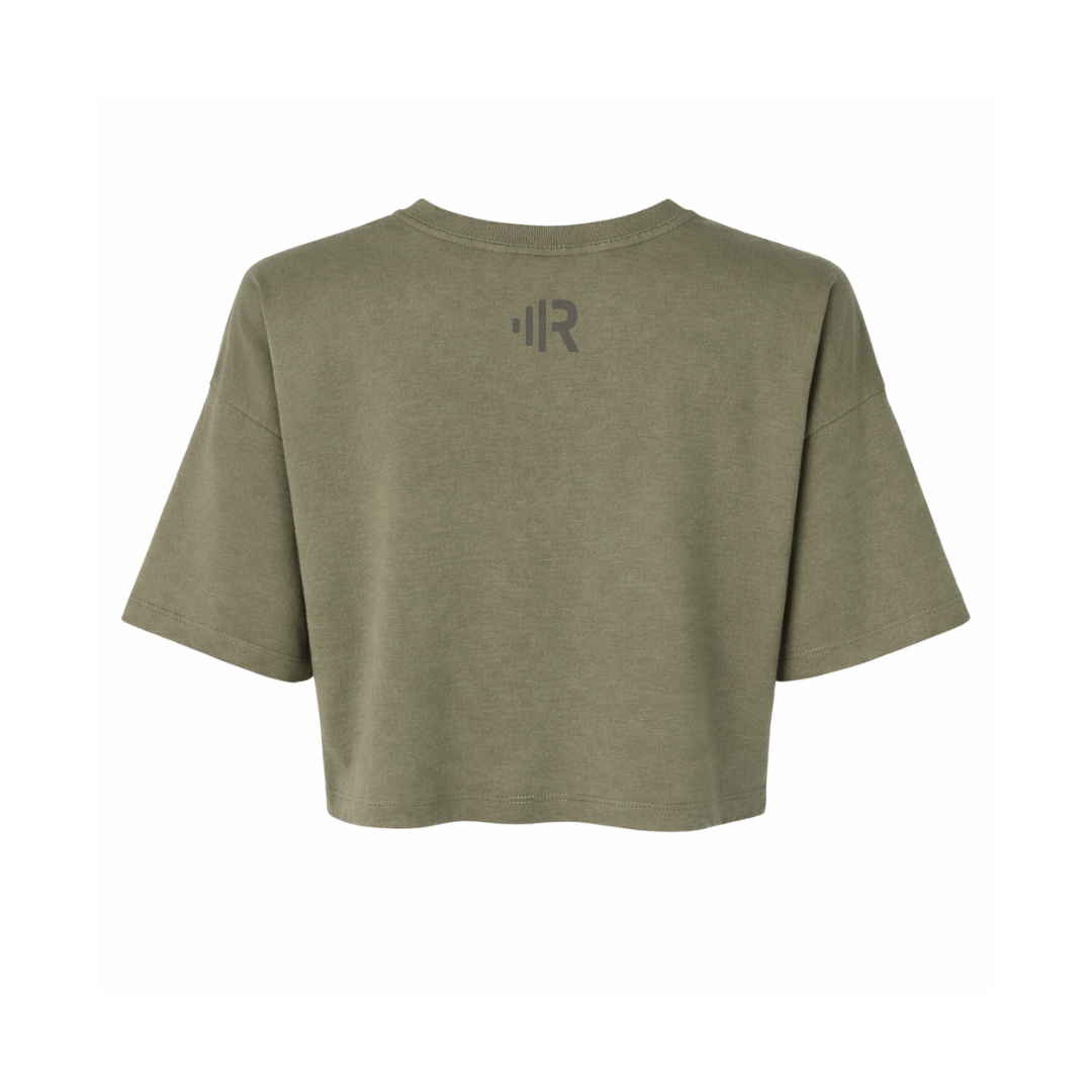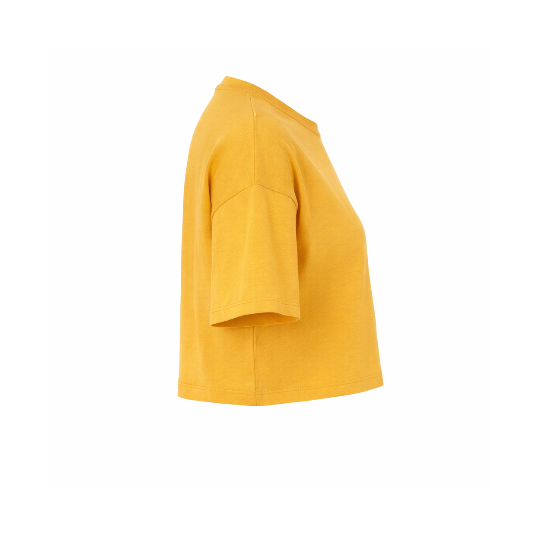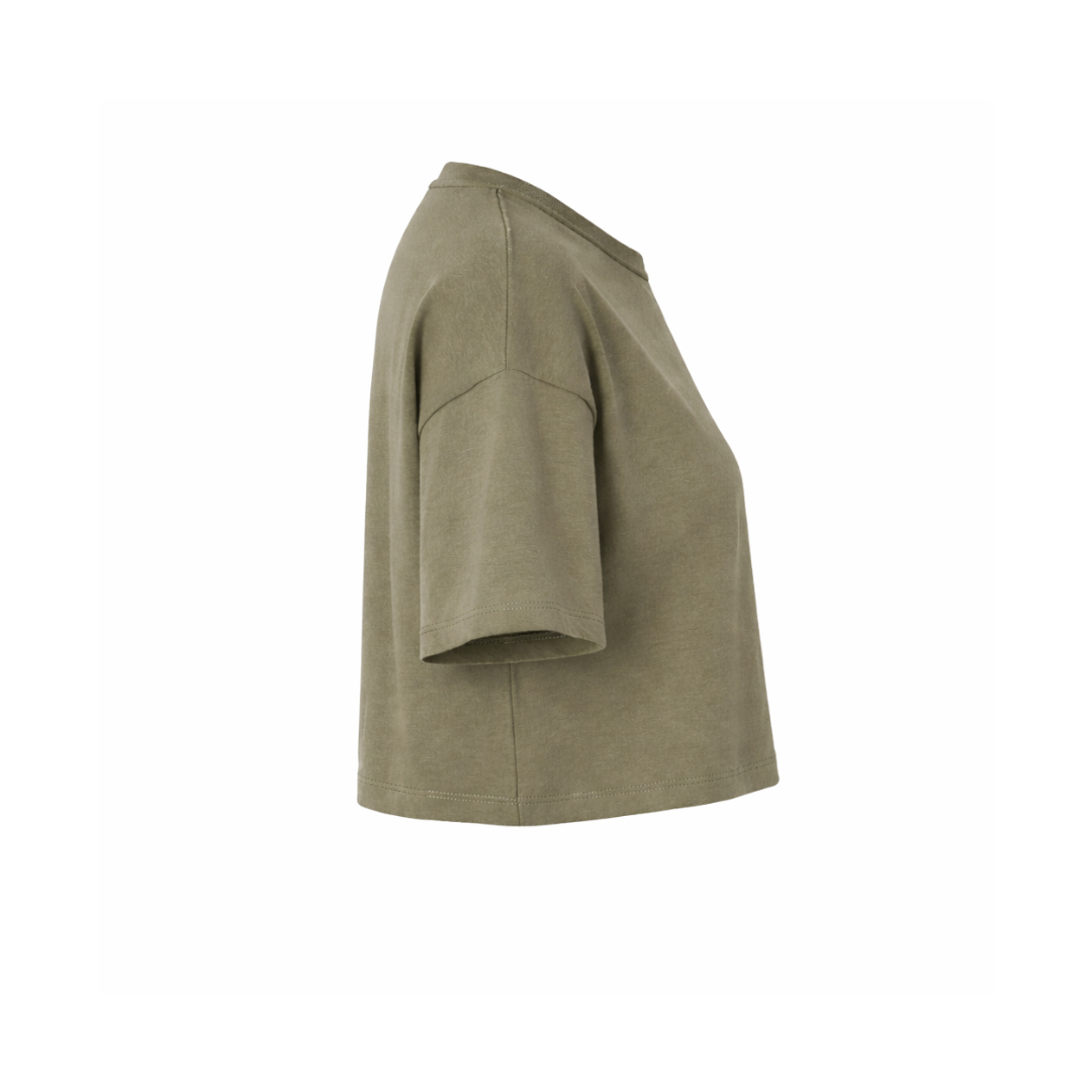 Camiseta crop oversize de manga corta y ancha. Su corte holgado y amplio crea una silueta equilibrada y potente, dejando espacio para el movimiento y manteniendo la estructura intacta.